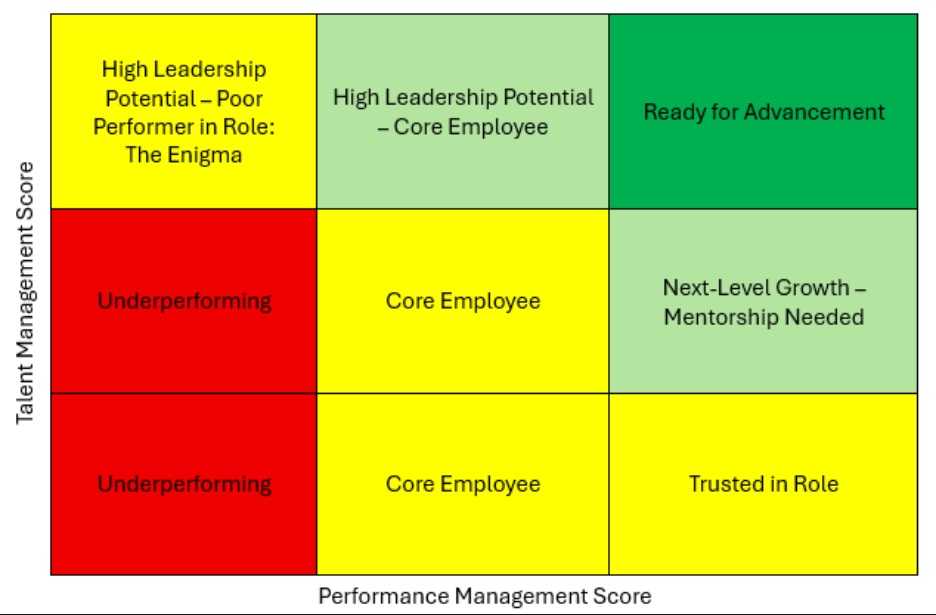 First, the 9 blocker uses current performance management and talent management scores to place a prospective successor in 4 basic categories: Dark Green: Ready for advancement; Light Green: Leadership potential but growth needed; Yellow: Potentially core employee (the enigma being the employee in this group who scores high on talent management but has a low performance score); Red: No current chance for advancement. The additional information that should be requested from potential successors (Dark and Light Green) is their 1) willingness and 2) ability to be promoted.